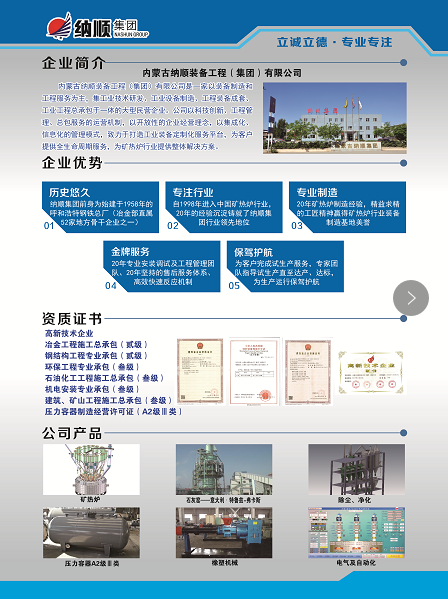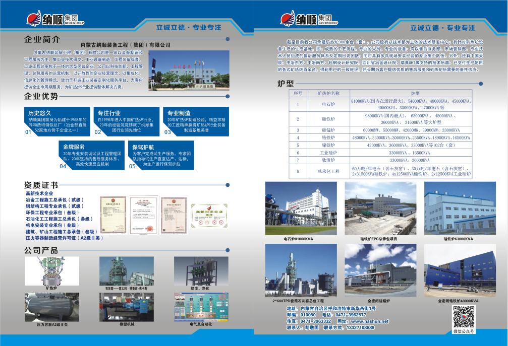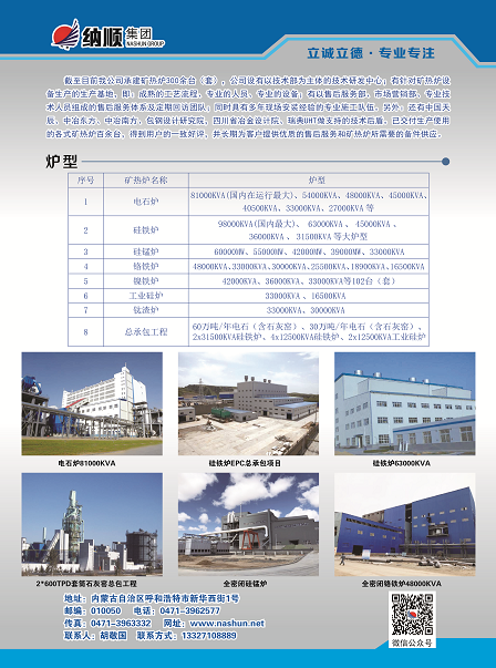 内蒙古纳顺装备工程(集团)有限公司是专业生产矿热炉、电石炉成套设备的著名企业,董事长郜俊先生(13804718430),营销副总胡敬国先生(电话13327108889)热诚欢迎铁合金企业、相关企业洽谈合作事宜!
