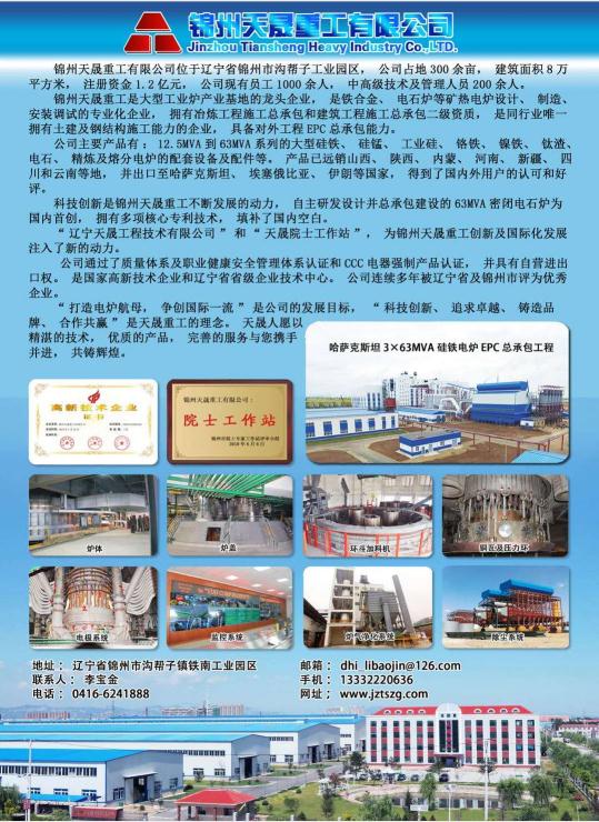 锦州天晟重工有限公司专业生产各种铁合金电炉、镍铁炉、电石炉及二次补偿等设备,是集专业设计、制造、安装、技术服务一体化的大型机电设备企业,总经理李宝金先生(电话 133 3222 0636)、经理赵伟先生(电话 139 4068 4088)热诚欢迎相关企业朋友!咨询与合作,共同发展!有需要铁合金电炉制作及二次补偿的朋友与李总、赵总联系!