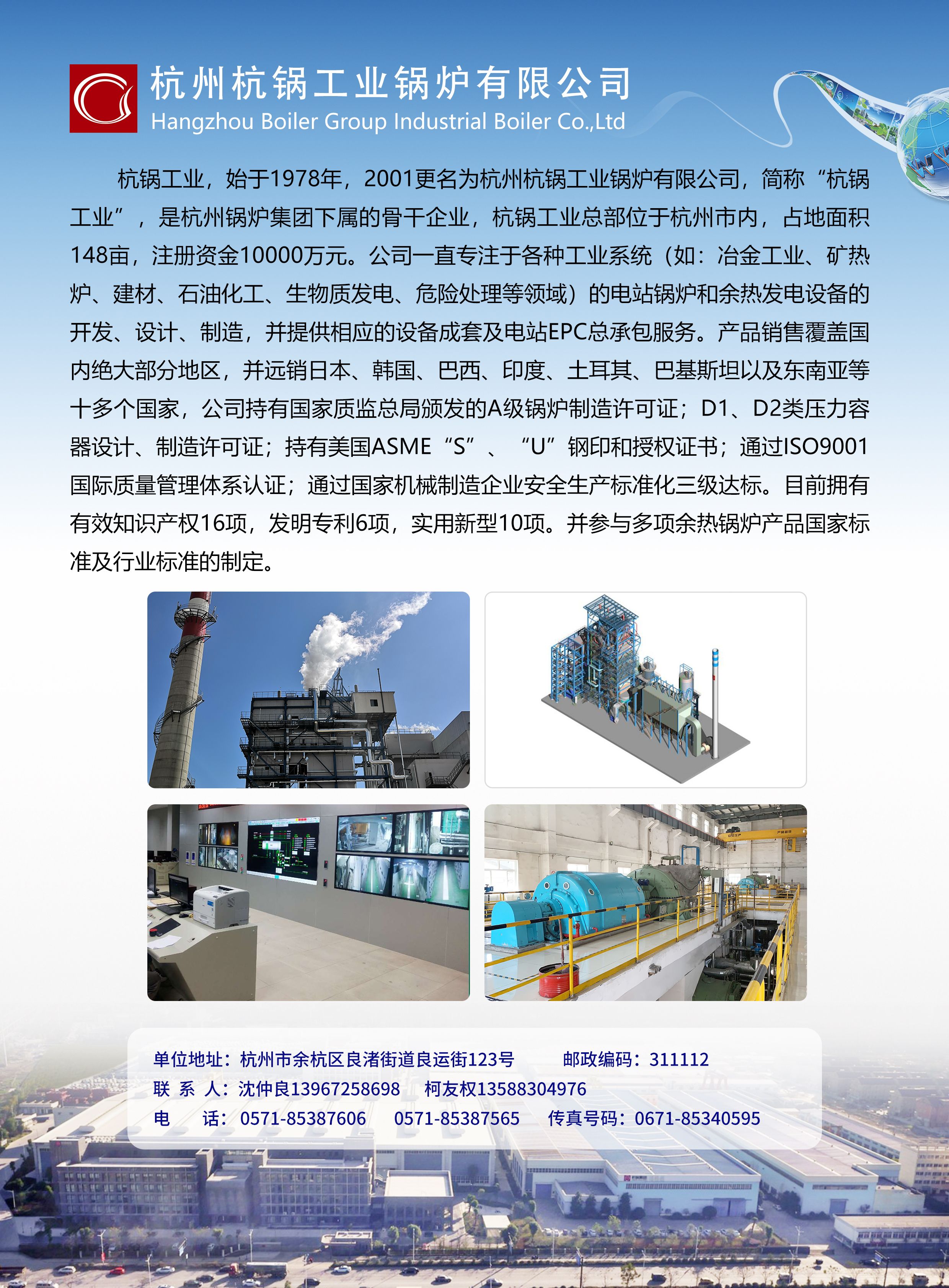 杭州杭锅工业锅炉有限公司下属设备成套工程公司目前主营业务有工业余热能、太阳能、风能、波浪能、地热能、沼气能、垃圾能等新能源的技术咨询、技术服务、技术转让及实际应用工程的工程设计、设备成套、工程施工、工程服务、工程总承包;节能及其它可再生新能源工艺技术、装备技术的研究开发;机械、电气、自动化控制设备及其零部件的研发、制造、组装、销售等。总经理沈仲良(13967258698)热诚欢迎您来电洽谈合作业务!